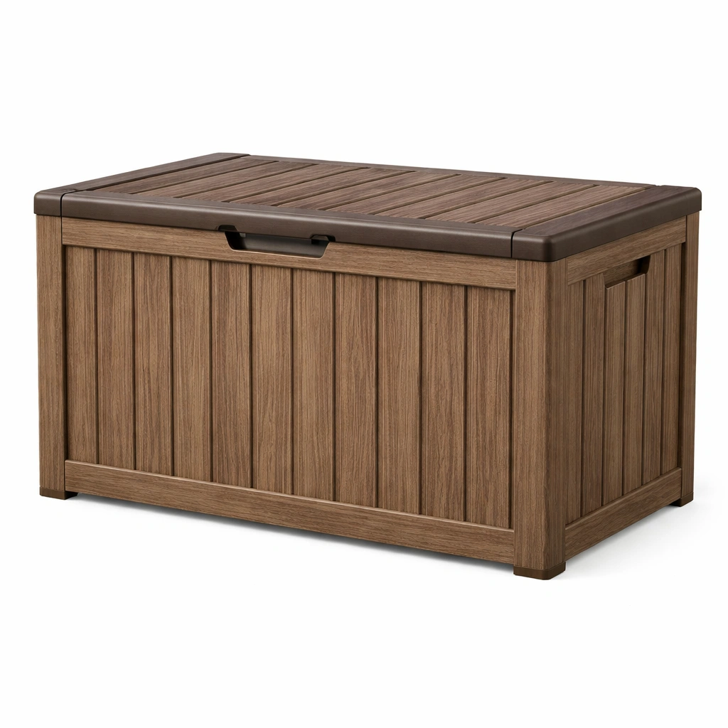 Baúl de almacenamiento diseñado para uso en exteriores. Fabricado con resina plástica de alta resistencia, garantiza durabilidad y resistencia a las condiciones climáticas. Su acabado marrón se integra en espacios de jardín o terraza.